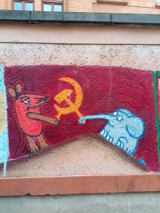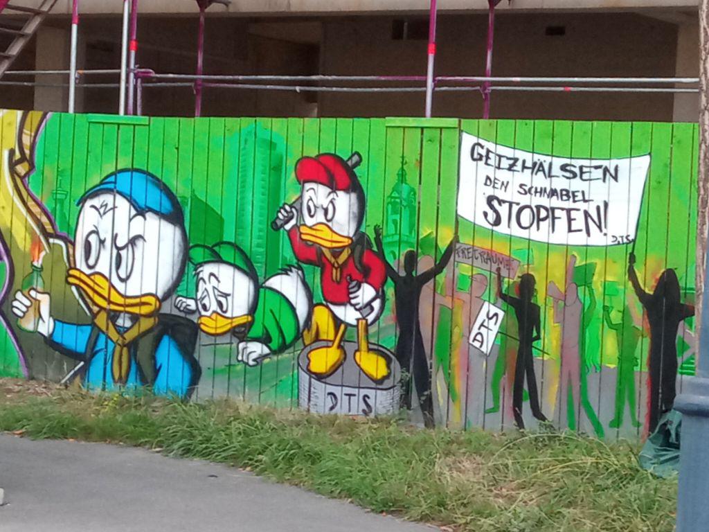 Zum Glück wird das alles durch wohlplatzierte antikapitalistische Graffitti konterkariert: