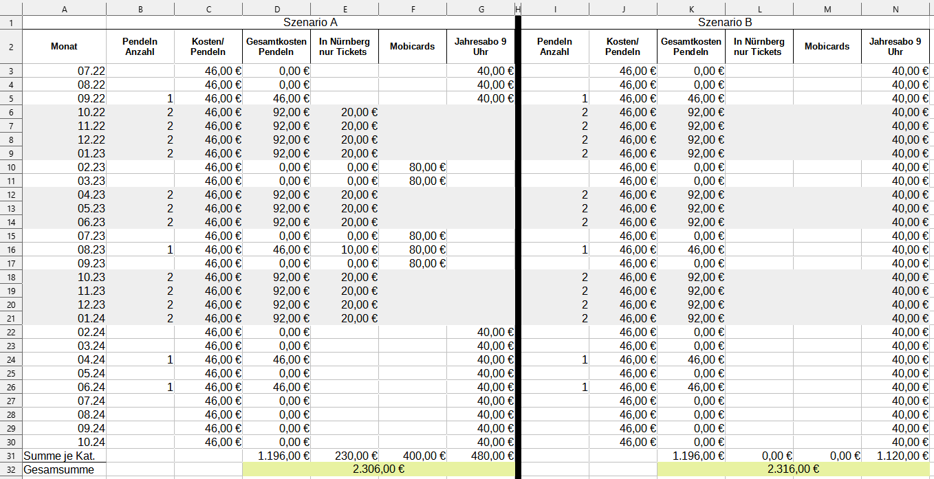 Ich gehe dabei davon aus, dass ich 2 Mal im Monat – wie oben skizziert – nach Nürnberg und wieder zurück nach Jena fahre; dass ich dann in Nürnberg je Heimfahrt ungefähr 10 Euro an Tickets verfahre (4 Fahrten bzw. eine Fahrt plus Wochenendticket o.ä.); und dass ich in den Zeiträumen, in denen ich arbeite, dann eine nicht-übertragbare 30-Tage-Mobicard (80 Euro) oder eine übertragbare 9-Uhr-Mobicard (73 Euro) benötige. Alternativ behalte ich einfach mein 9-Uhr-Abo und spare mir Einzeltickets und Mobicards. Das Ergebnis: Beides kostet nahezu dasselbe, siehe Tabelle unten. Vielleicht lassen sich hier noch 100 Euro irgendwo sparen, aber das Ticket aufzugeben ist den Mehraufwand eigentlich nicht wert.